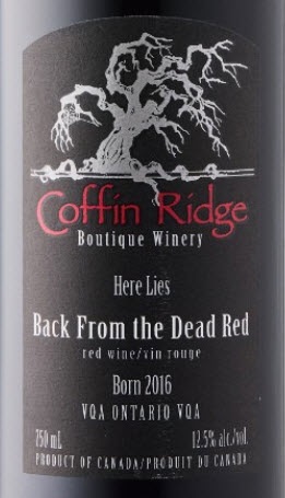 Right! What an appropriate name for this wine. Back From the Dead Red is a mouth-watering Maréchal Foch, Baco Noir (from Coffin Ridge), Cabernet Sauvignon and Merlot (from Niagara) red wine blend with brambly, red berry, plum and savoury herb and dark spice flavours on the palate. Finishes with great acidity for food. Pair with sautéed wild mushrooms, blue cheese over steak. - Community Wine Reviews